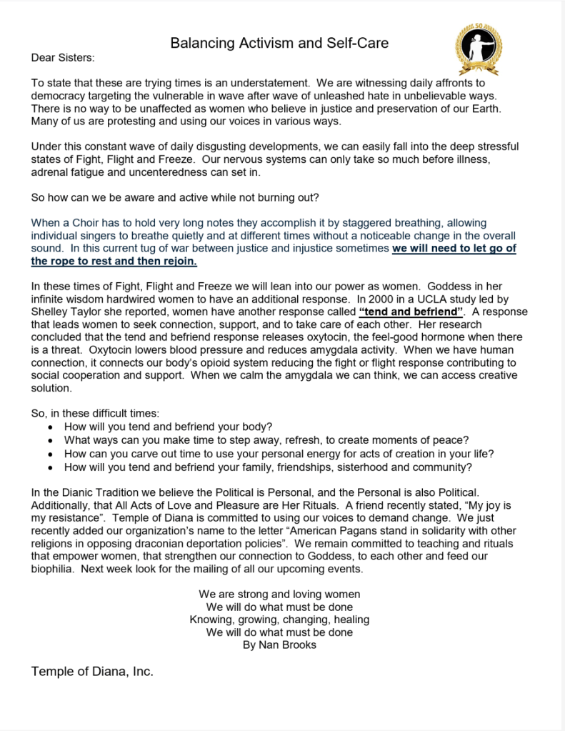 In addition to online and in-person seasonal rituals and classes offered year-round by our groves, the Temple has two annual gatherings: These Daughters of Diana Gatherings are held annually in April on Zoom and in October in-person in the mountains of Southern California.